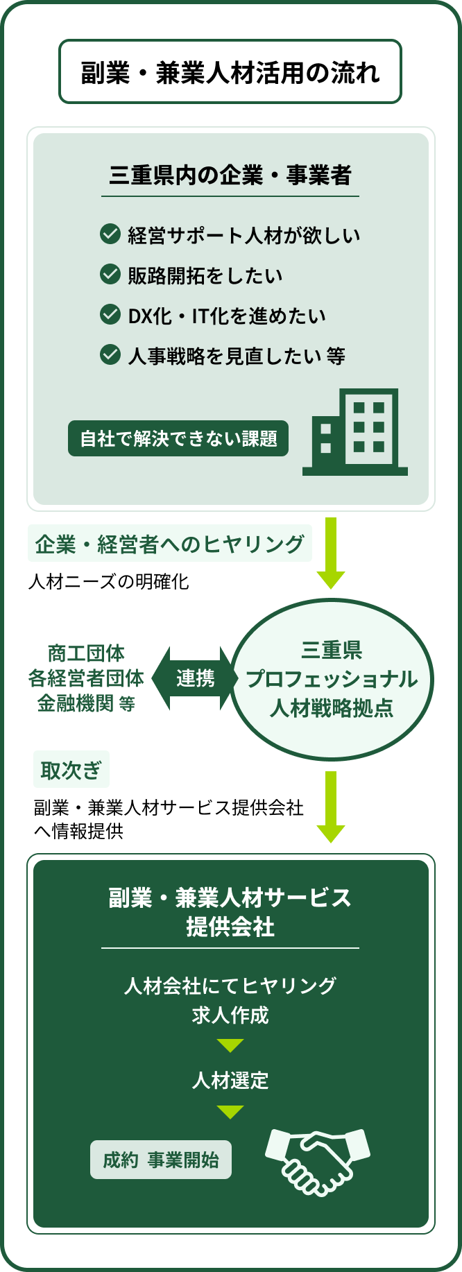 三重県プロフェッショナル人材戦略拠点担当者が訪問し、経営者と共に経営課題を整理し、企業にとって本当に必要な人材像を明確にし、求人に対するミッション、会社のビジョンも明確にします。会社の課題や改善するべき事項にあわせて、最適な副業・兼業プロ人材を活用することができます。